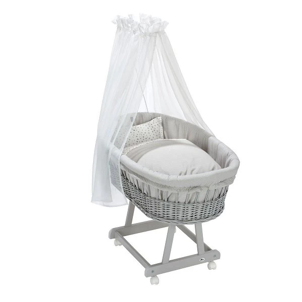 Der Alvi Birthe Stubenwagen bietet noch mehr Komfort fürs Baby: Der extra große Korb aus handgeflochtener Weide sitzt auf einem Untergestell aus vollmassiver Kiefer und ist durch seine vier gebremsten Rollen sicher und flexibel. Der Alvi Birthe Stubenwagen wird mit Himmelstange und Matratze geliefert und bietet einen zauberhaften und kuscheligen Schlafplatz.
