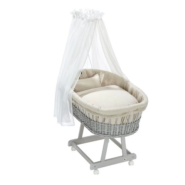 Der Alvi Birthe Stubenwagen bietet noch mehr Komfort fürs Baby: Der extra große Korb aus handgeflochtener Weide sitzt auf einem Untergestell aus vollmassiver Kiefer und ist durch seine vier gebremsten Rollen sicher und flexibel. Der Alvi Birthe Stubenwagen wird mit Himmelstange und Matratze geliefert und bietet einen zauberhaften und kuscheligen Schlafplatz.