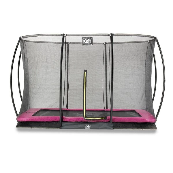 Das EXIT Silhouette Bodentrampolin ist ein kompaktes rechteckiges Trampolin mit einem rosa Schutzrand. Es wird auf eine Grube im Boden gestellt und so ist sichergestellt, dass die Kinder bei einem Fehlsprung von einem hohen Trampolin herunterfallen können.
