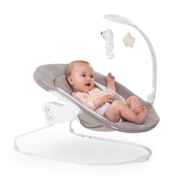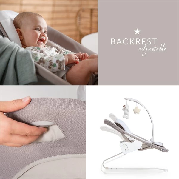 Die Rückenlehne lässt sich per Einhand-Bedienung in Liegeposition verstellen. Ein Mobile sowie die Möglichkeit, den Aufsatz auch als Babywippe zu nutzen, sorgen für entspannte Abwechslung.