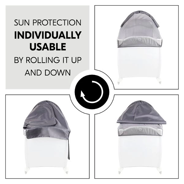 Das Travel Bed Canopy ist ein praktischer Alltagshelfer für Reisen und schützt Ihr Kind effektiv vor Sonneneinstrahlung und Insekten. Circa 2/3 des Verdecks sind aus einem abgedunkelten Stoff, der einen UV-Schutz von 50+ bietet. Bei Bedarf lässt sich die Abdunklung einfach aufrollen und fixieren, sodass der integrierte Insektenschutz voll zur Geltung kommt. Das Netz sorgt für eine gute Luftzirkulation und einen erholsamen Schlaf Ihres Kindes.