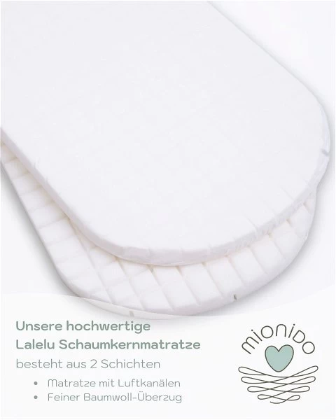 Im Mionido Stubenwagen Maxi liegt Ihr Kind immer in Ihrer Nähe. Ihr Baby kann bis zum 8 Monat diesen geborgenen und sicheren Schlafplatz genießen. Die große Liegefläche bietet zudem eine optimale Rückatmung in dem Korb. Der Boden des Mionido Stubenwagen Maxi ist mehrfach gelocht und sorgt so für ausreichende Belüftung. Die Füllmaterialien sind atmungsaktiv.