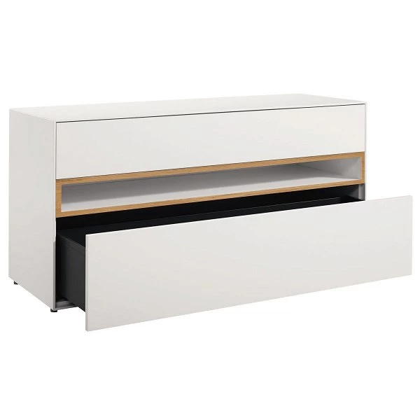 Der now! by hülsta easy Baukasten 4R verfügt über 2 Schubladen und 1 offenes Fach mit genügend Stauraum. Lieferung inkl. 1,5 cm hohen Stellfüßen. Der Rahmen ist in Natureiche gehalten.