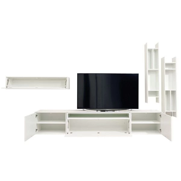 Das Lowboard verfügt über 1 offenes Fach und 1 Klappe hinter der sich ein geräumiges Fach befindet. Der Rahmen ist in reinweiß.