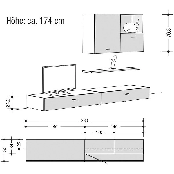 Gesamt: 174 x 280 x 52 cm (H x B x T)