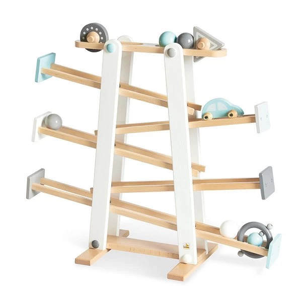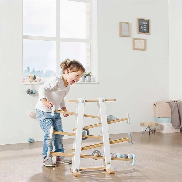 Die Pinolino Kugelbahn Kuno ist aus Buchenholz gefertigt und wird mit 4 bunten Kugeln, 3 Rollelemente und 1 Auto geliefert. So kann der Spielspaß sofort beginnen.