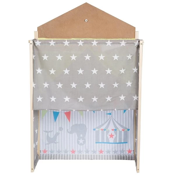 Das Roba Kasperletheater kann frei im Raum stehen und begeistert zwei Puppenspieler zugleich. Das Rollenspiel fördert die Kreativität Ihres Kindes und die mit Zirkusmotiven bedruckte Stoffbespannung bietet ein farbenfrohes Spielerlebnis. Natürlich darf ein Vorhang bei einem Theater nicht fehlen und eine Uhr zeigt Ihnen wann die Vorstellung beginnt.