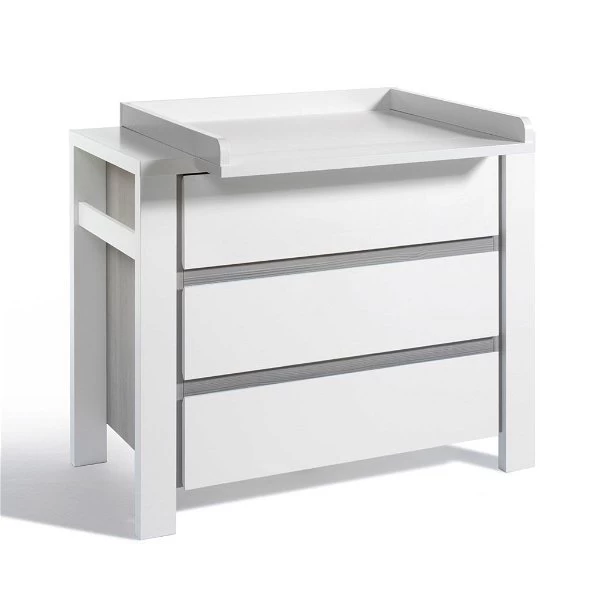 Die Wickelkommode Milano Pinie ist mit einem abnehmbaren Wickelaufsatz ausgestattet. Die drei langen Schübe mit Selbsteinzug bieten viel Platz für Windeln und Pflegemittel. Die Wickelhöhe beträgt 90 cm.