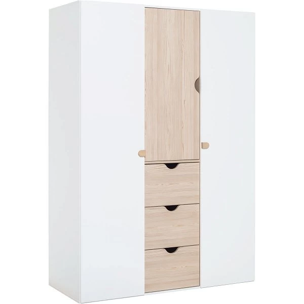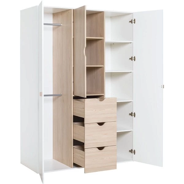 Der VOX Stige Kleiderschrank bietet viel Platz für Kleidung und mehr. Hinter den äußeren Türen des Kleiderschrankes befinden sich 4 Einlegeböden und 2 Kleiderstangen, im Mittelteil 2 Einlegeböden und 3 Schubladen.